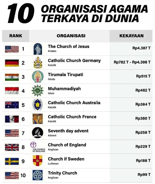 Daftar 10 Organisasi Keagamaan Terkaya di Dunia (2025)