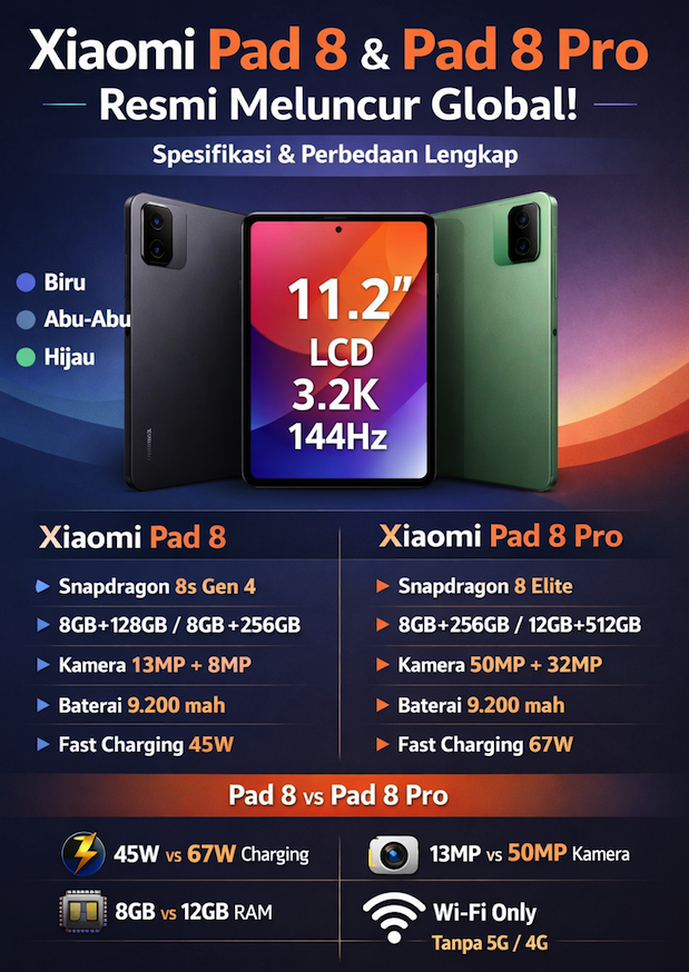 Kedua tablet ini menyasar segmen premium produktivitas dan multimedia. Dengan layar 144Hz dan dukungan stylus profesional, Xiaomi Pad 8 dan Pad 8 Pro cocok untuk mahasiswa, kreator konten, desainer, hingga pekerja remote.